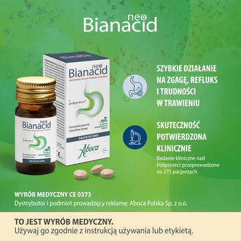 NeoBianacid Nadkwaśność i Refluks, tabletki do ssania – wyrób medyczny w postaci tabletek do ssania o przyjemnym smaku, którego formuła opiera się na roślinnych i mineralnych kompleksach molekularnych. Przeznaczony jest do łagodzenia objawów towarzyszących nadkwaśności żołądka u dorosłych i dzieci powyżej 6. roku życia.
