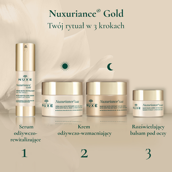Rozświetlający balsam pod oczy z serii Nuxuriance Gold marki Nuxe to produkt kosmetyczny, którego formuła zawiera 96,1% składników naturalnych, w tym komórki Bi-Florales® szafranu i bugenwilli, kompleks Oleactif® z róży porcelanowej, połączenie jogulanu i kwiatu czystka oraz albicję i Sigesbeckia orientalis. Składniki aktywne wspomagają odżywianie, regenerowanie, wygładzanie, rozjaśnianie i rewitalizowanie skóry wokół oczu. Wspierają również działania przeciwstarzeniowe i przywracające cerze jednolity koloryt.