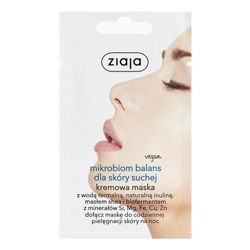 Maska do twarzy dla skóry suchej z serii Mikrobiom Balans marki Ziaja to produkt kosmetyczny, którego składniki aktywne to woda termalna, olej canola, masło shea, naturalna inulina i bioferment z krzemu, magnezu, żelaza, miedzi oraz cynku. Składniki aktywne pomagają: