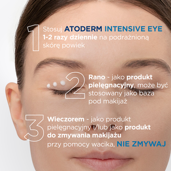 Bioderma Atoderm Intensive Eye, kojący krem 3w1 – produkt kosmetyczny z kompleksem LIPIGENIUM™, który wspomaga produkcję lipidoów i przywracanie naturalnej bariery ochronnej skóry. Zawarty w preparacie patent SKIN BARRIER THERAPY™, pomaga chronić skórę przed przyleganiem do niej bakterii, które mogą powodować suchość skóry. Kwas hialuronowy wspiera odpowiednie nawilżenie i ochronę skóry przed nadmierna utratą wody. Olejki eteryczne wspomagają oczyszczanie skóry z makijażu i zanieczyszczeń.