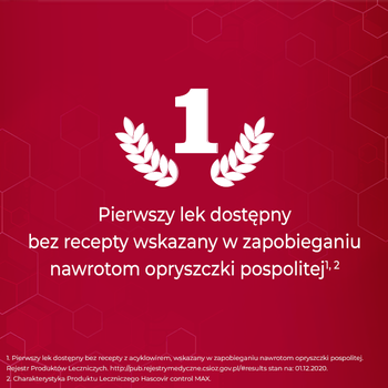 Hascovir control MAX stosuje się w: Zapobieganiu nawrotom opryszczki pospolitej u osób dorosłych, u których w przeszłości rozpoznano zakażenie wirusem opryszczki pospolitej. Lek jest przeznaczony dla pacjentów z prawidłową odpornością; Leczeniu nawrotowej opryszczki warg i twarzy lub zewnętrznych narządów płciowych wywołanej przez wirus opryszczki pospolitej (Herpes simplex) u dorosłych.