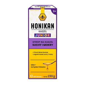 Honikan Kaszel Junior jest wyrobem medycznym na bazie miodu i naturalnego kompleksu Polisedox (który łączy w sobie właściwości babki lancetowatej, prawoślazu i malwy). Dzięki zawartości polisacharydów, o działaniu powlekającym i łagodzącym na górne drogi oddechowe łagodzi objawy kaszlu. Działa zarówno na kaszel produktywny, wspomagając nawilżenie i usuwanie flegmy oraz na kaszel suchy, przeciwdziałając podrażnieniu śluzówki. Aromaty brzoskwiniowy i truskawkowy nadają syropowi przyjemny smak.
