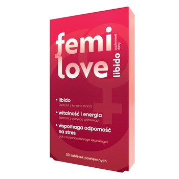Femilove Libido - to suplement diety w formie kapsułek, który w swoim składzie zawiera witaminę E, selen, L-argininę oraz ekstrakty roślinne. Produkt przeznaczony dla dorosłych.